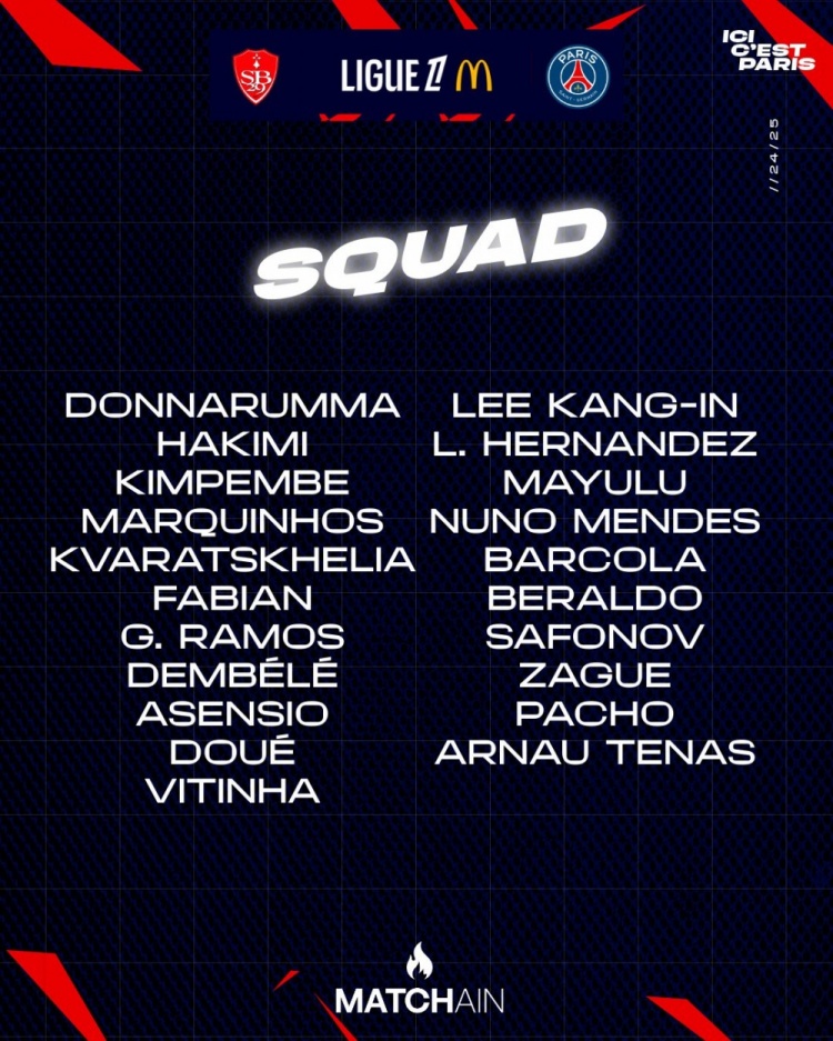 2月1日訊 北京時(shí)間2月2日凌晨0點(diǎn),法甲第20輪,巴黎圣日耳曼將在客場(chǎng)對(duì)陣布雷斯特。比賽開(kāi)始前,巴黎圣日耳曼官方公布了本場(chǎng)比賽大名單,若昂-內(nèi)維斯、扎伊爾-埃梅里缺席。