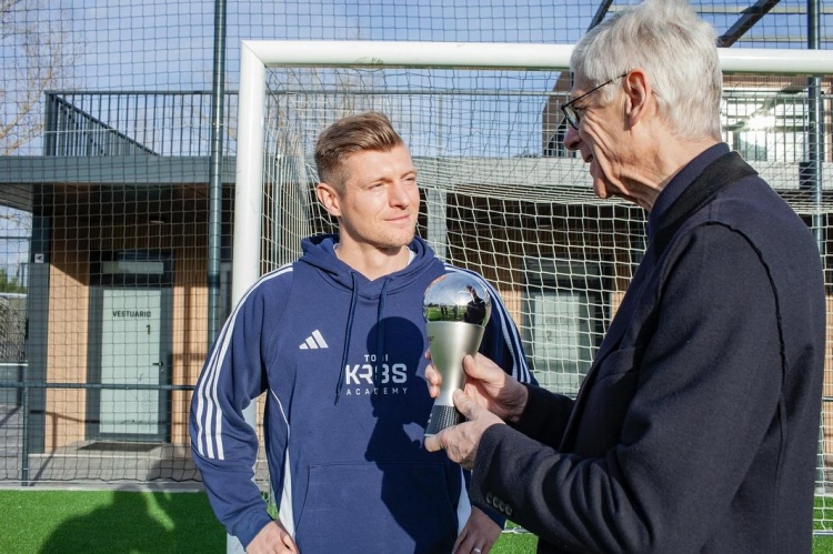 克羅斯曬出兩人的合影,并寫道:“非常榮幸歡迎溫格造訪克羅斯馬德里青訓(xùn)學(xué)校,并向他展示我的新項(xiàng)目。從他手中接過FIFA年度最佳11人獎(jiǎng)杯也令我倍感高興。”