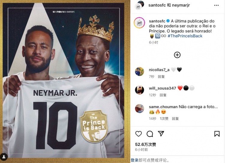 桑托斯在社媒曬出了一張?zhí)幚磉^的圖片,圖片中貝利手持內(nèi)馬爾的10號(hào)球衣,并和內(nèi)馬爾同框出現(xiàn)。桑托斯官媒為圖片配文寫道:“我們的國王和王子。你的遺產(chǎn)將被繼承!”