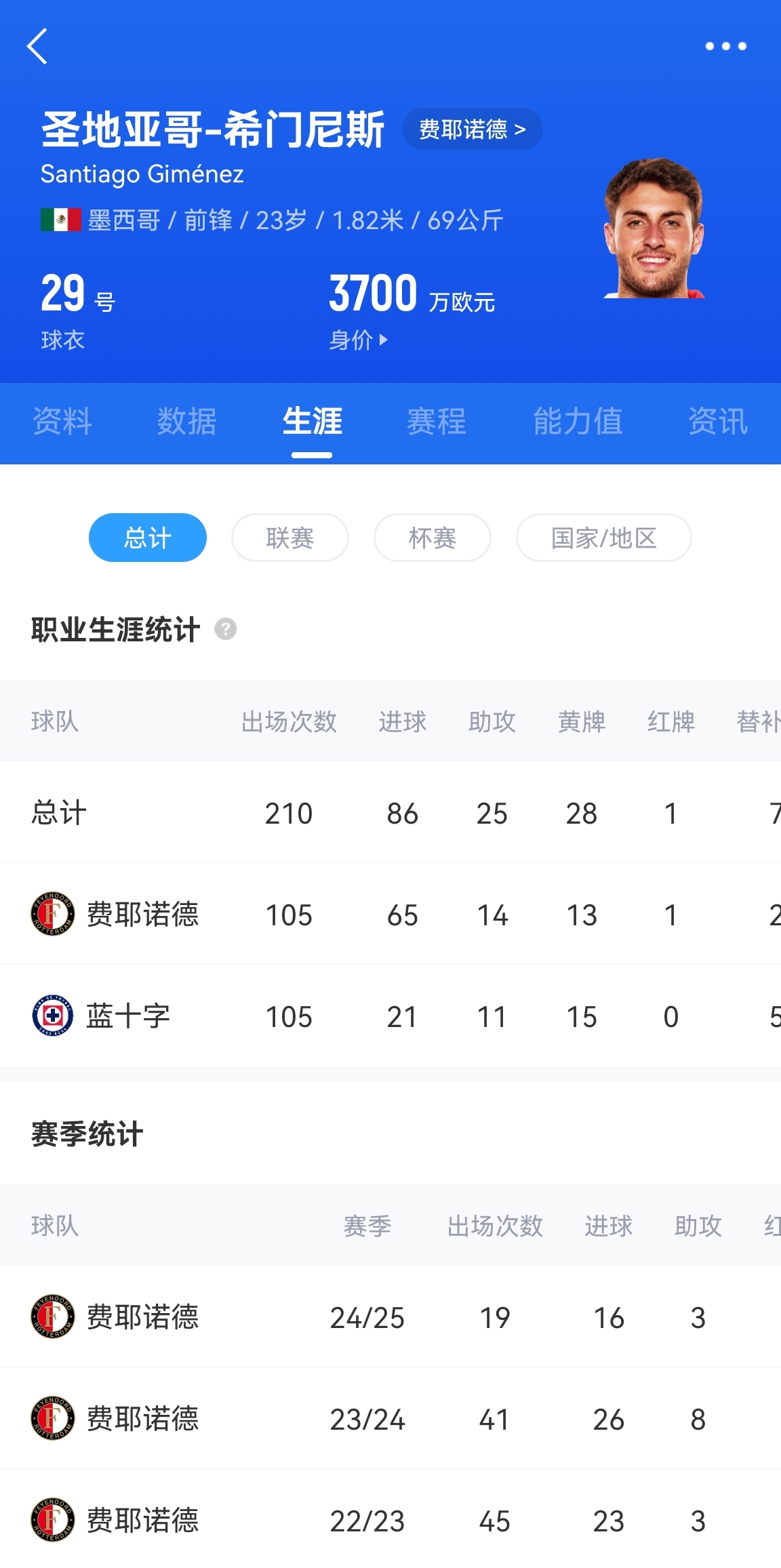 希門尼斯現(xiàn)年23歲,墨西哥前鋒,2022年600萬歐元從墨西哥藍(lán)十字加盟費耶諾德,截至目前共為費耶諾德出戰(zhàn)105次打入65球,其中本賽季出場19次,打進(jìn)16球并有3次助攻。目前他的德轉(zhuǎn)身價為3700萬歐元。