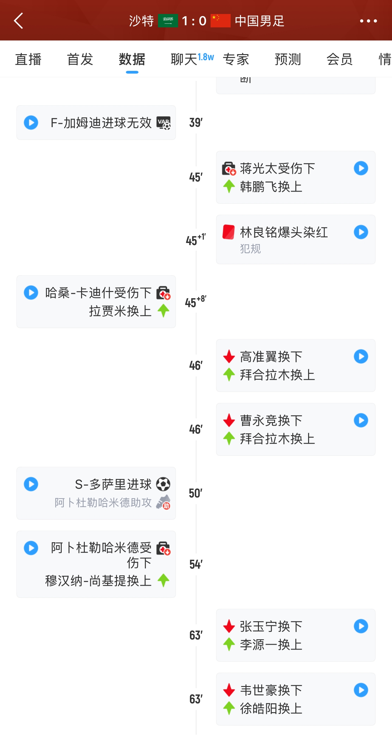 比賽第62分鐘,國足已經(jīng)用完了全部5個換人名額,先后登場的球員分別是韓鵬飛、拜合拉木、楊澤翔、徐皓陽、李源一,歸化國腳塞爾吉尼奧無緣國足首秀!