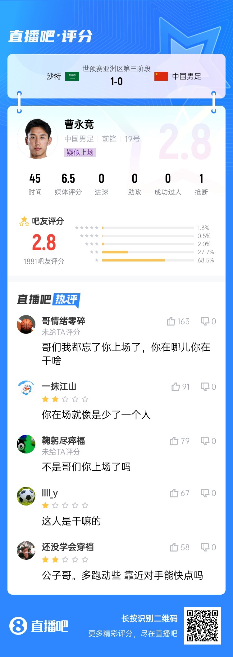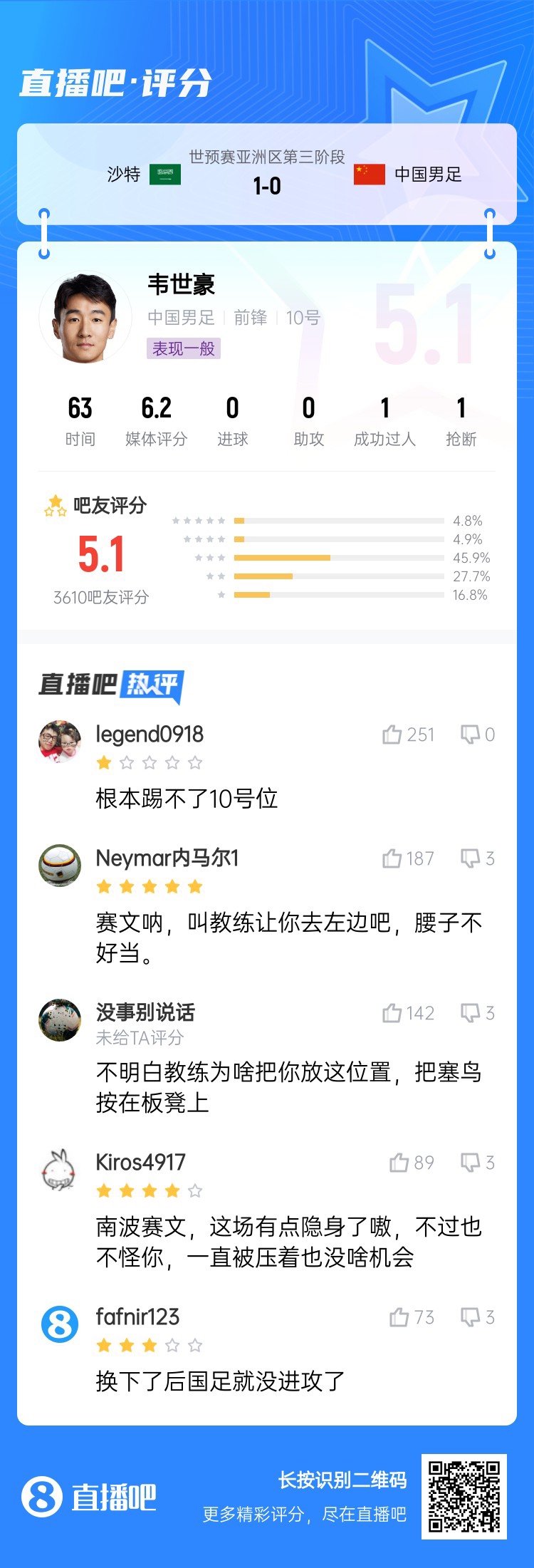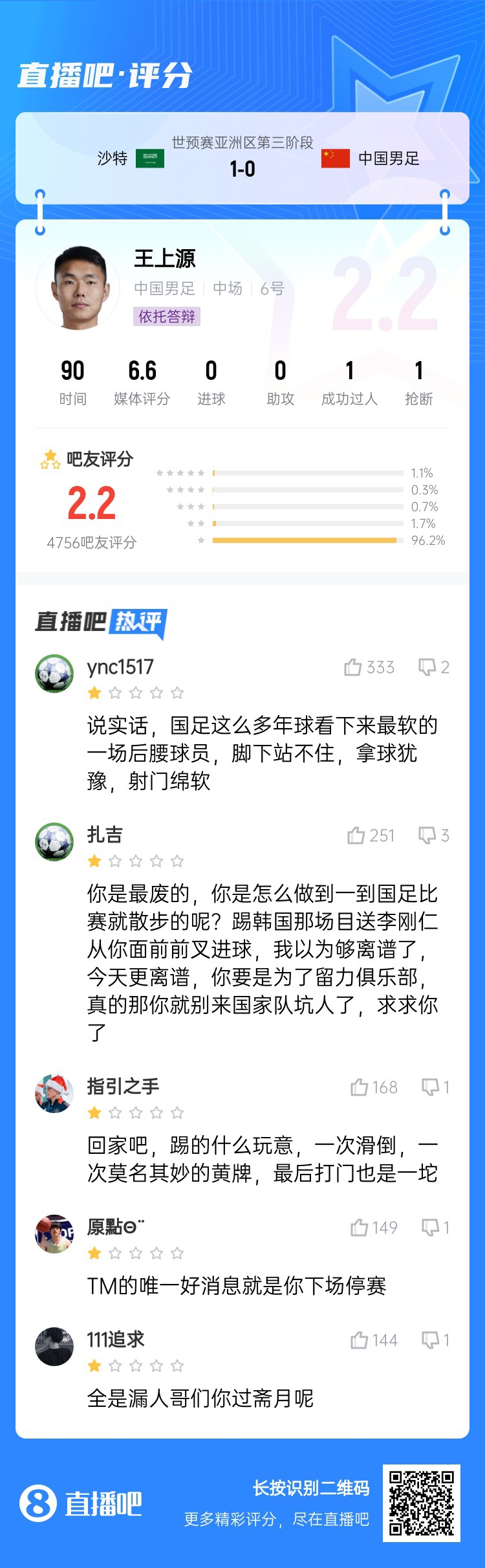 18強(qiáng)賽關(guān)鍵戰(zhàn),國(guó)足0-1不敵沙特,沒(méi)能擺脫小組墊底。吧友評(píng)分中,國(guó)足中場(chǎng)球員普遍低分,韋世豪5.1分,王上源2.2分,曹永競(jìng)2.8分,王上源2.2分。