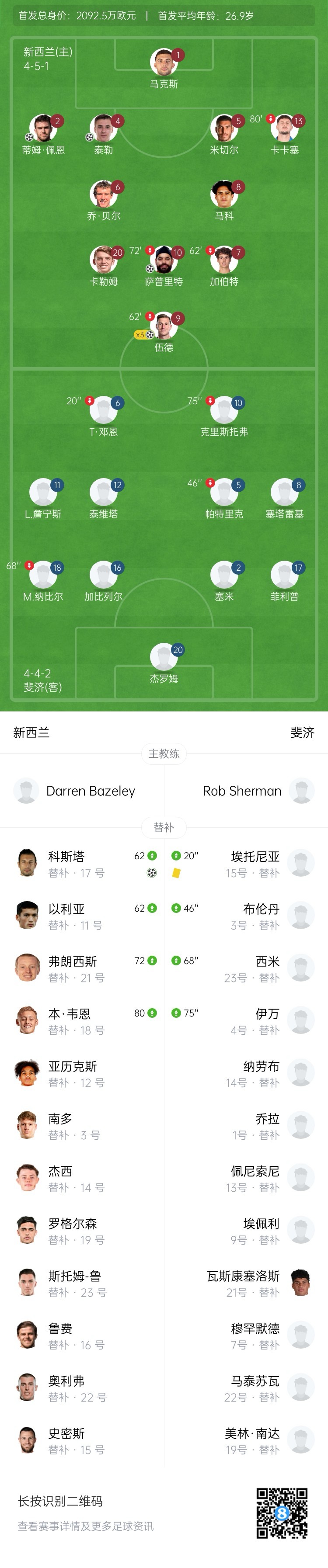 新西蘭目前FIFA排名第89名,比中國隊(duì)高一名(中國FIFA第90),新西蘭陣中頭號前鋒是效力于諾丁漢森林的伍德,身價1000萬歐。