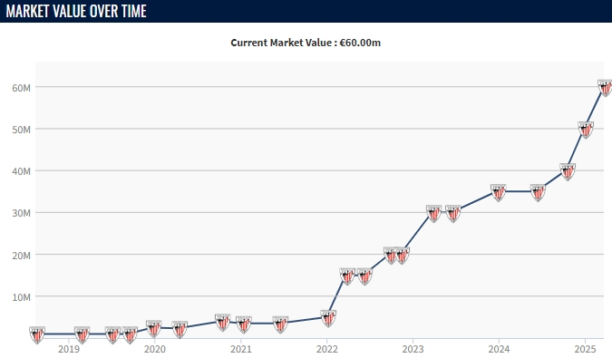 桑謝特在場(chǎng)上司職進(jìn)攻型中場(chǎng),2015年加入畢爾巴鄂青訓(xùn),2020年正式進(jìn)入一線隊(duì)。近年來(lái)桑謝特的身價(jià)一直穩(wěn)步上升,過(guò)去半年他的身價(jià)已經(jīng)連續(xù)兩次上漲1000萬(wàn)歐。