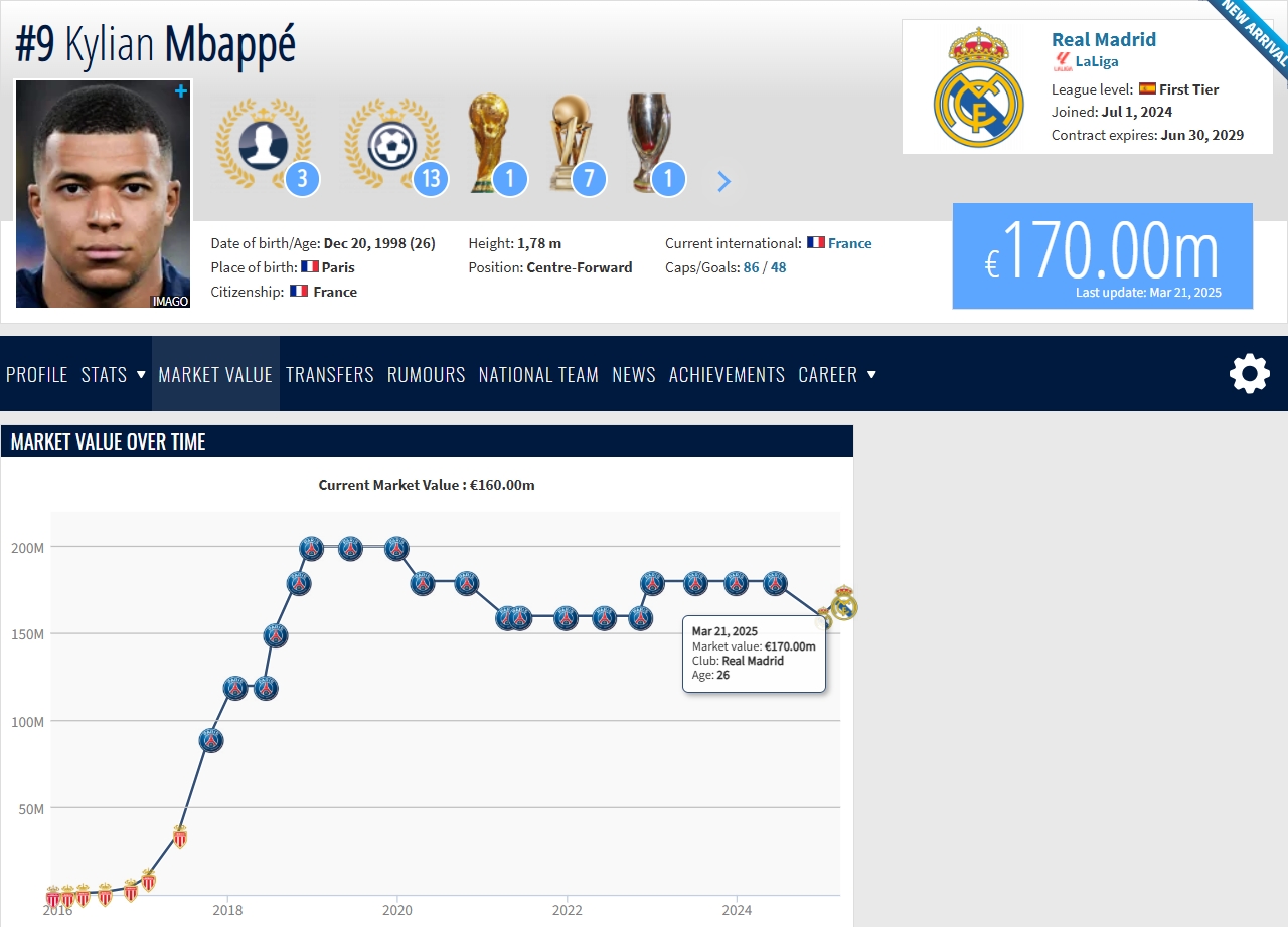 26歲姆巴佩生涯身價(jià)走勢(shì):加盟皇馬先下跌后回漲至1.7億,巔峰2億