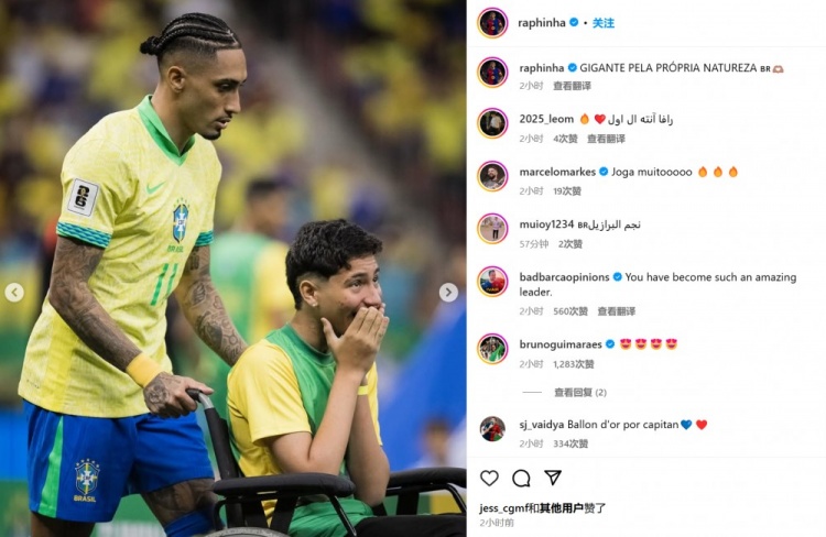 拉菲尼亞也通過社媒曬出自己賽前為殘障球迷手推輪椅的照片,并配文:“他們在心靈層面是巨人?!?/p>