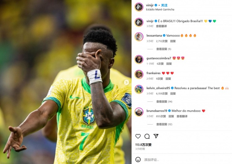 維尼修斯也在賽后通過社媒曬出自己的慶祝照,并配文:“這就是巴西?。?!感謝巴西利亞?。。 ?/p>