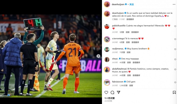 他也在賽后通過(guò)社媒曬出自己的替補(bǔ)登場(chǎng)照,并配文:“為國(guó)家隊(duì)完成首秀就是夢(mèng)想成真。我們周日再見(jiàn),西班牙!”
