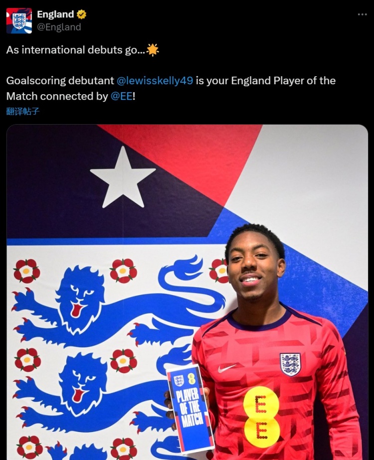 英格蘭隊(duì)官方也在賽后宣布,首秀破門的小將斯凱利被英格蘭球迷票選為本場(chǎng)比賽隊(duì)內(nèi)最佳球員。