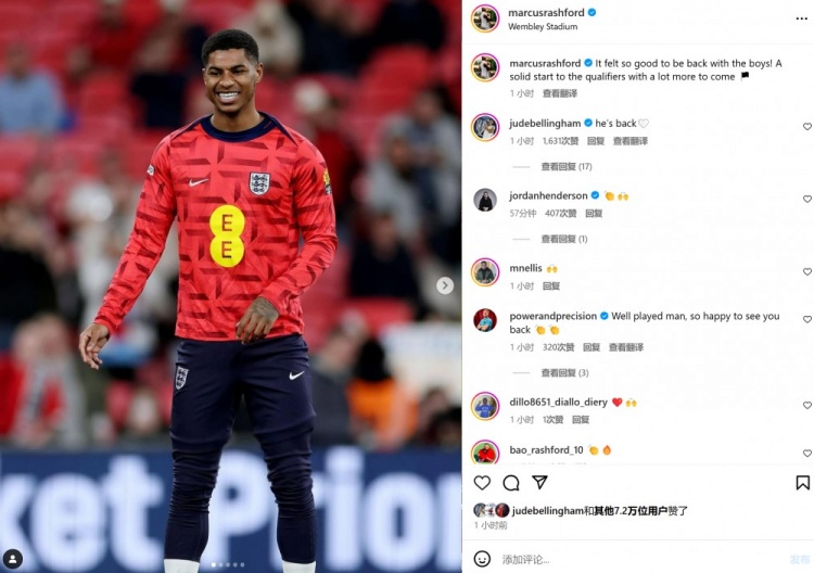 本場(chǎng)比賽拉什福德首發(fā)上陣,賽后他也在個(gè)人社媒曬出笑容滿面的訓(xùn)練照,配文寫道:“重回球隊(duì)并與這些隊(duì)友重聚感覺太棒了,為世預(yù)賽奠定堅(jiān)實(shí)的基礎(chǔ),后面還有更多挑戰(zhàn)!”