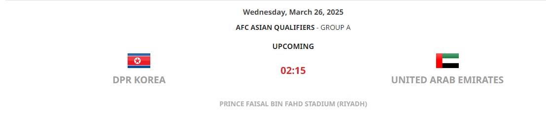 03月22日訊 亞足聯(lián)官網(wǎng)顯示,18強(qiáng)賽第8輪,朝鮮主場對(duì)陣阿聯(lián)酋的比賽將在沙特利雅得進(jìn)行。