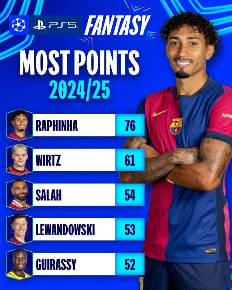 1月24日訊 歐冠小組賽階段第7輪比賽已經(jīng)完賽,歐冠官方也統(tǒng)計(jì)了本賽季球員表現(xiàn)積分情況,拉菲尼亞領(lǐng)跑。