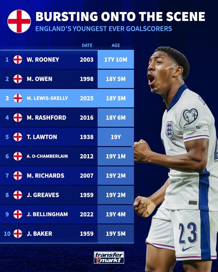 18歲5個(gè)月!斯凱利是英格蘭隊(duì)史第3年輕進(jìn)球者,僅次魯尼&歐文