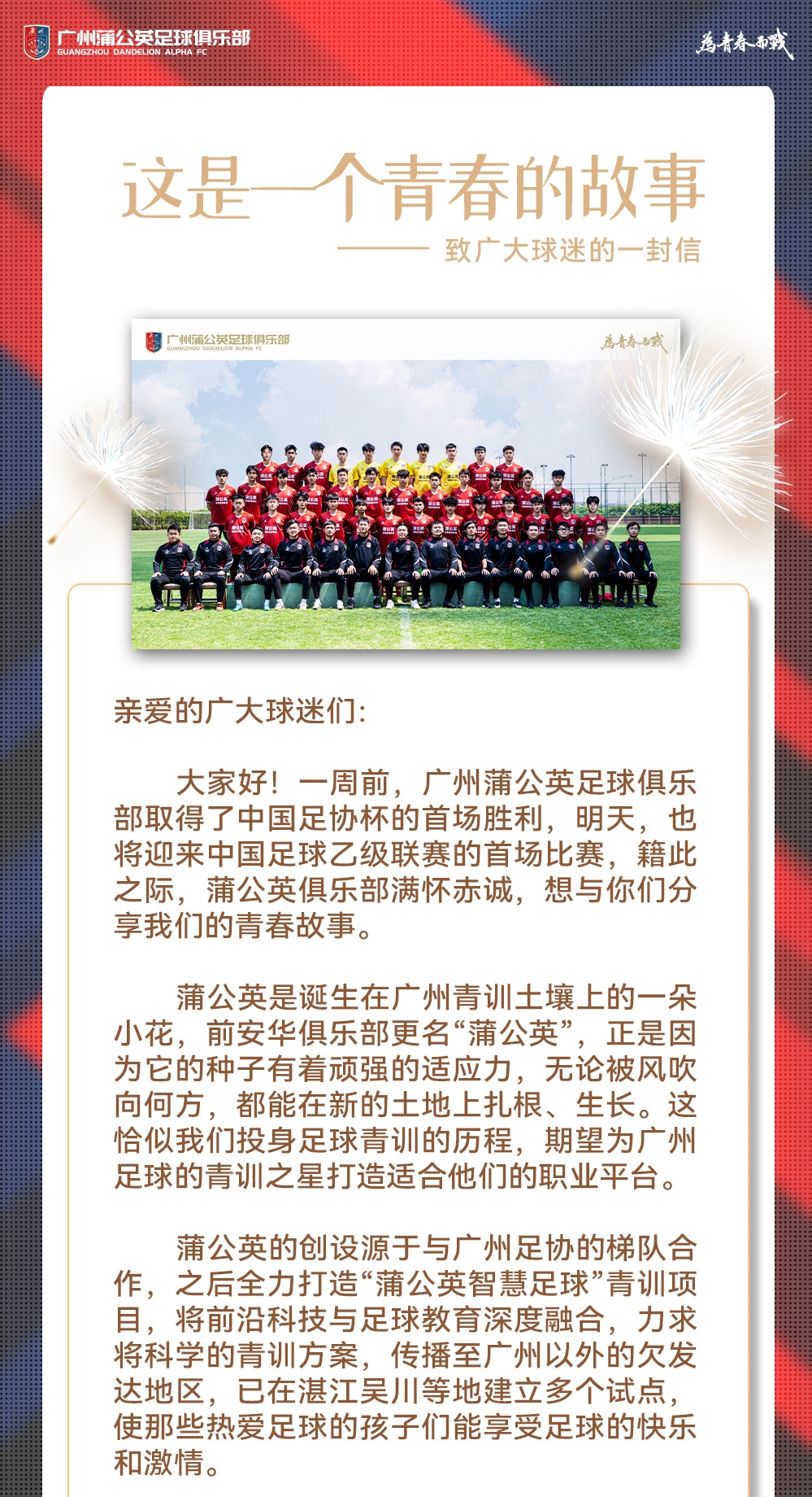 03月22日訊 2025賽季中乙本周開(kāi)賽,新軍廣州蒲公英在收隊(duì)比賽前發(fā)布了致廣大球迷的一封信,在信中俱樂(lè)部講述了球隊(duì)的歷史,并表達(dá)了將做好青訓(xùn)的決心和對(duì)球迷的感謝。