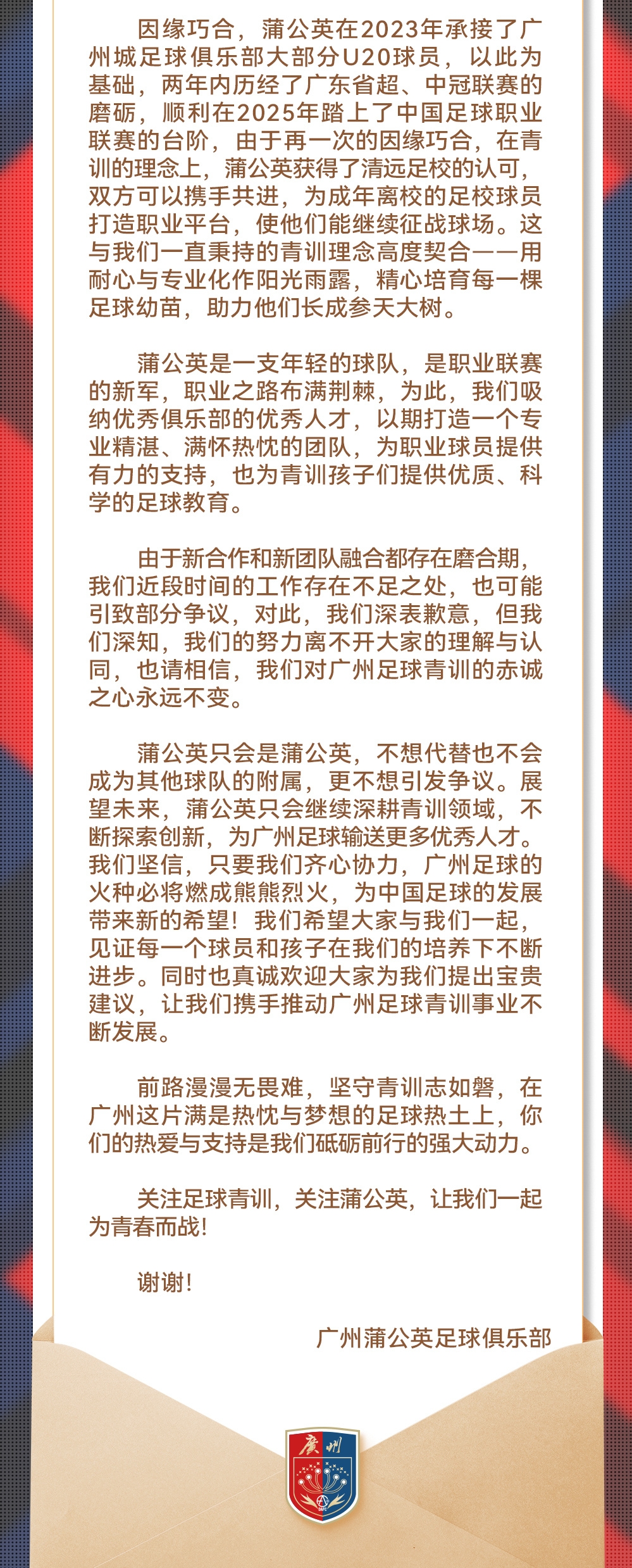 蒲公英只會(huì)是蒲公英,不想代替也不會(huì)成為其他球隊(duì)的附屬,更不想引發(fā)爭(zhēng)議。展望未來(lái),蒲公英只會(huì)繼續(xù)深耕青訓(xùn)領(lǐng)域,不斷探索創(chuàng)新,為廣州足球輸送更多優(yōu)秀人才。我們堅(jiān)信,只要我們齊心協(xié)力,廣州足球的火種必將燃成熊熊烈火,為中國(guó)足球的發(fā)展帶來(lái)新的希望!我們希望大家與我們一起,見(jiàn)證每一個(gè)球員和孩子在我們的培養(yǎng)下不斷進(jìn)步,同時(shí)也真誠(chéng)歡迎大家為我們提出寶貴建議,讓我們攜手推動(dòng)廣州足球青訓(xùn)事業(yè)不斷發(fā)展。
