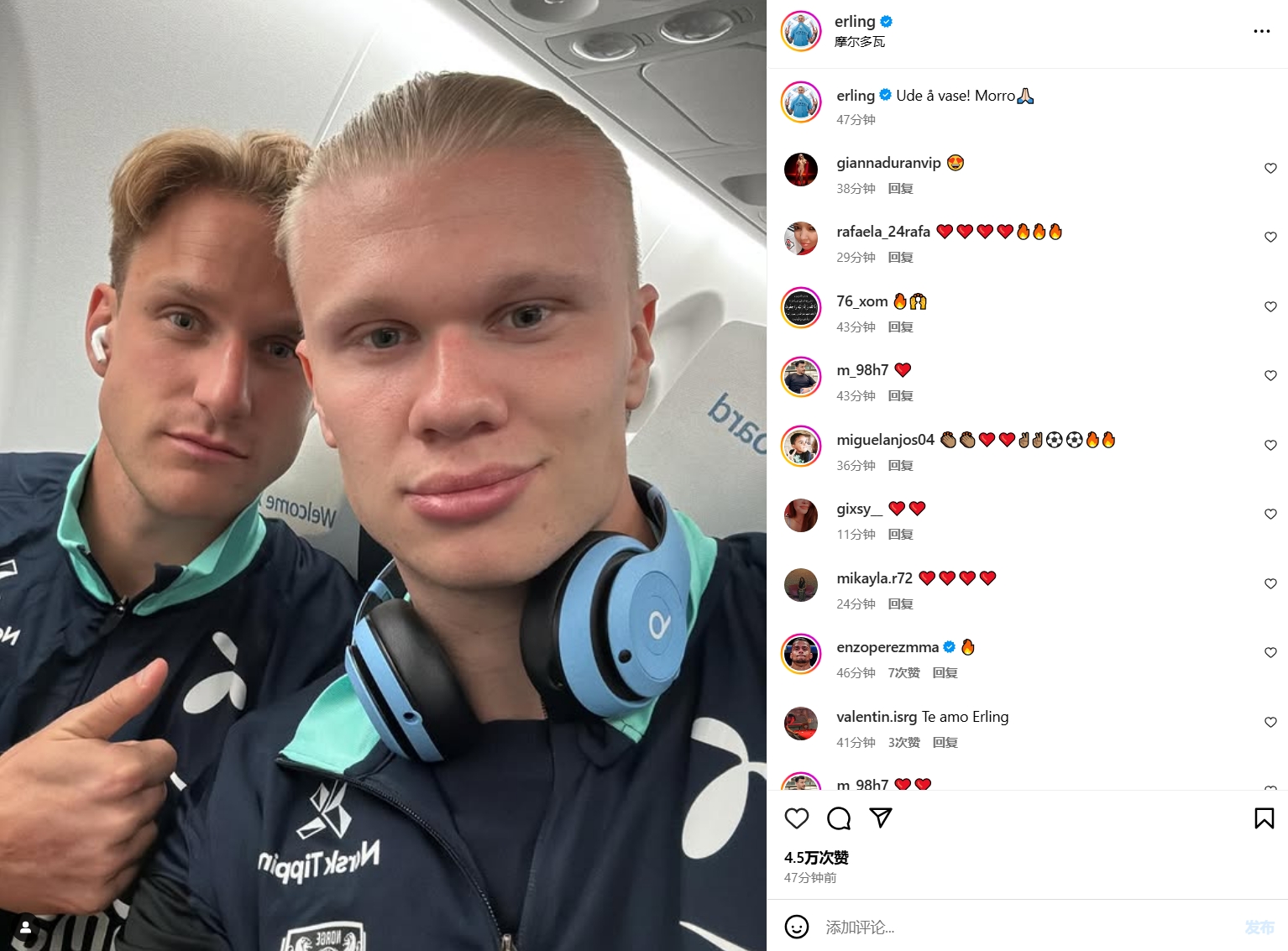 哈蘭德更新社媒動(dòng)態(tài),曬出與國家隊(duì)隊(duì)友博特海姆的合照,配文:“出去瞎逛,有趣?!?/p>