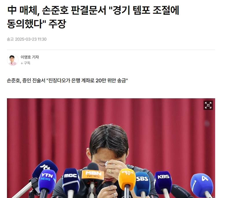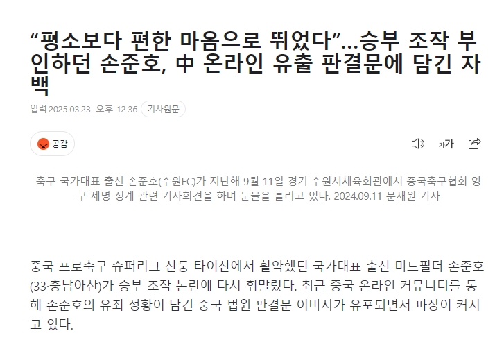 韓媒標(biāo)題:“我比平時(shí)更放松心態(tài)比賽”孫準(zhǔn)浩否認(rèn)操縱比賽,但在中國(guó)網(wǎng)絡(luò)上泄露的判決書(shū)中承認(rèn)了這一罪行。