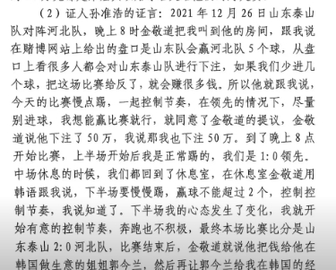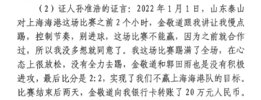 證言中,孫準浩表示在泰山2-2平海港之前,金敬道說讓慢點踢這場不能贏。賽后,金敬道給孫準浩20萬人民幣;在2-0河北之前,孫準浩跟著金敬道下注50萬,這場比賽結(jié)束后金敬道把錢給金敬道姐姐郭今蘭,郭今蘭再給孫準浩的哥哥。