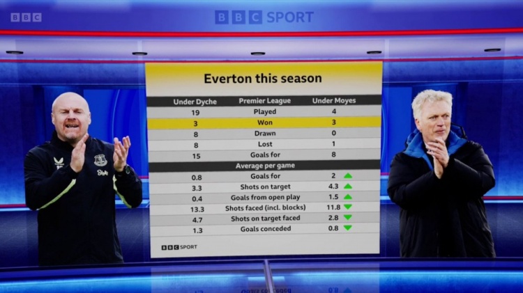 2月2日訊 英超第24輪比賽,埃弗頓主場4-0完勝萊斯特城。據(jù)BBC統(tǒng)計,莫耶斯上任以來埃弗頓3勝1負,場均進球、失球等多項數(shù)據(jù)均優(yōu)于戴奇執(zhí)教期間。