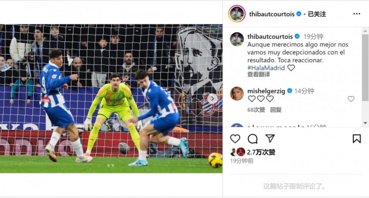 庫爾圖瓦在社交媒體上曬出比賽照片,并寫道:“盡管我們的表現(xiàn)配得上更好的結(jié)果,但我們?nèi)匀粚κЮ械椒浅J?,是時候做出反應(yīng)了?!?/p>