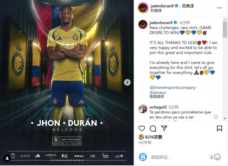 杜蘭社媒:很高興加盟利雅得勝利,將為這身球衣付出一切