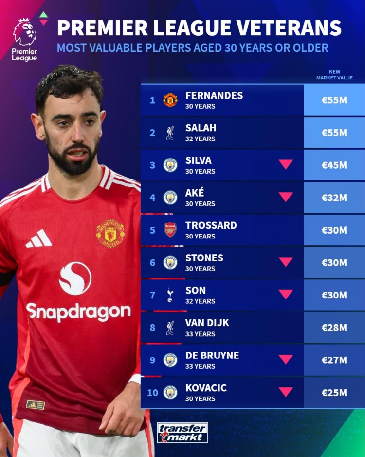 英超年齡30+球員身價(jià)榜:B費(fèi)、薩拉赫5500萬(wàn)歐居首,B席第三