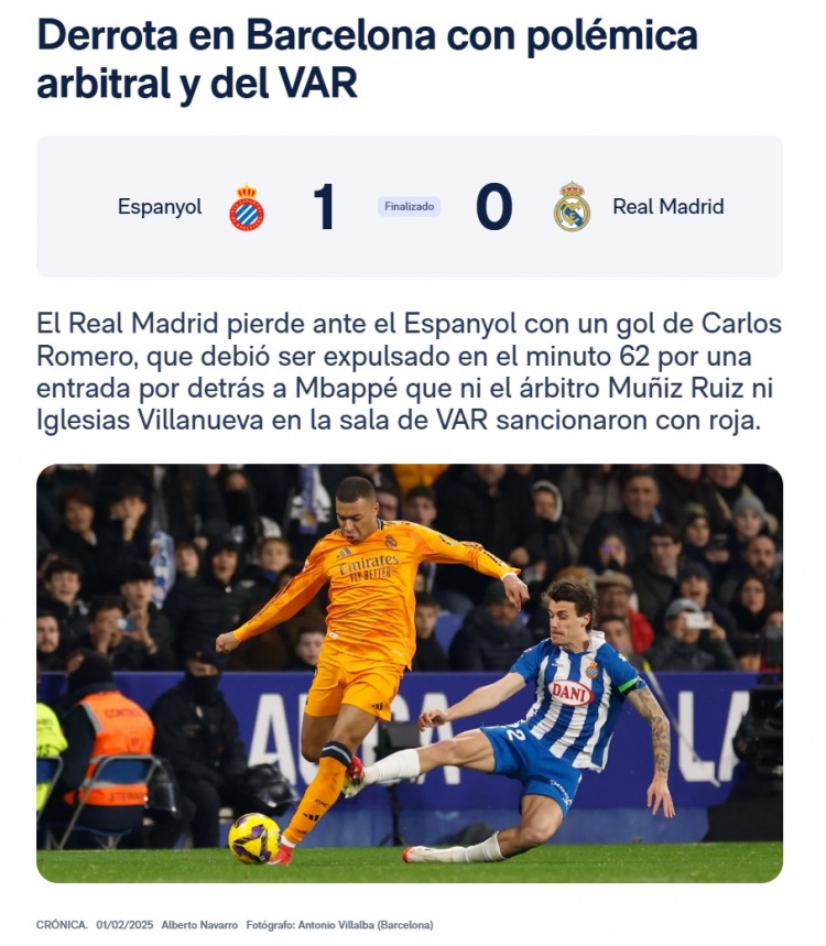 皇馬因?yàn)榭逅?羅梅羅的進(jìn)球輸給了西班牙人,而羅梅羅本應(yīng)在第62分鐘因背后鏟倒姆巴佩被罰下場,但主裁判穆尼茲-魯伊斯和VAR室的伊格萊西亞斯-比利亞努埃瓦都沒有給他紅牌。