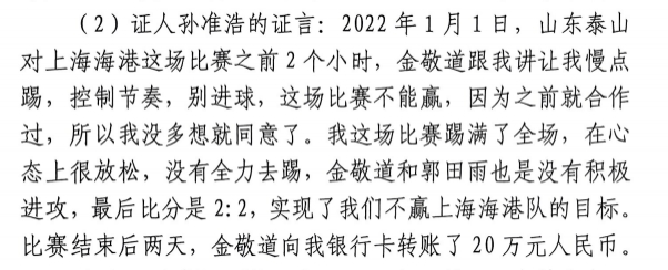 其中孫準(zhǔn)浩的證言為:“2022年1月1日,山東泰山對(duì)上海海港這場比賽之前2個(gè)小時(shí),金敬道跟我講讓我慢點(diǎn)踢,控制節(jié)奏,別進(jìn)球,這場比賽不能贏,因?yàn)橹熬秃献鬟^,所以我沒多想就同意了。我這場比賽踢滿了全場,在心態(tài)上很放松,沒有全力去踢,金敬道和郭田雨也是沒有積極進(jìn)攻,最后比分是2:2,實(shí)現(xiàn)了我們不贏上海海港隊(duì)的目標(biāo)。 比賽結(jié)束后兩天,金敬道向我銀行卡轉(zhuǎn)賬了20萬元人民幣?!?/p>