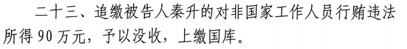 二十三、追繳被告人秦升的對非國家工作人員行賄違法所得90萬元,予以沒收,上繳國庫。