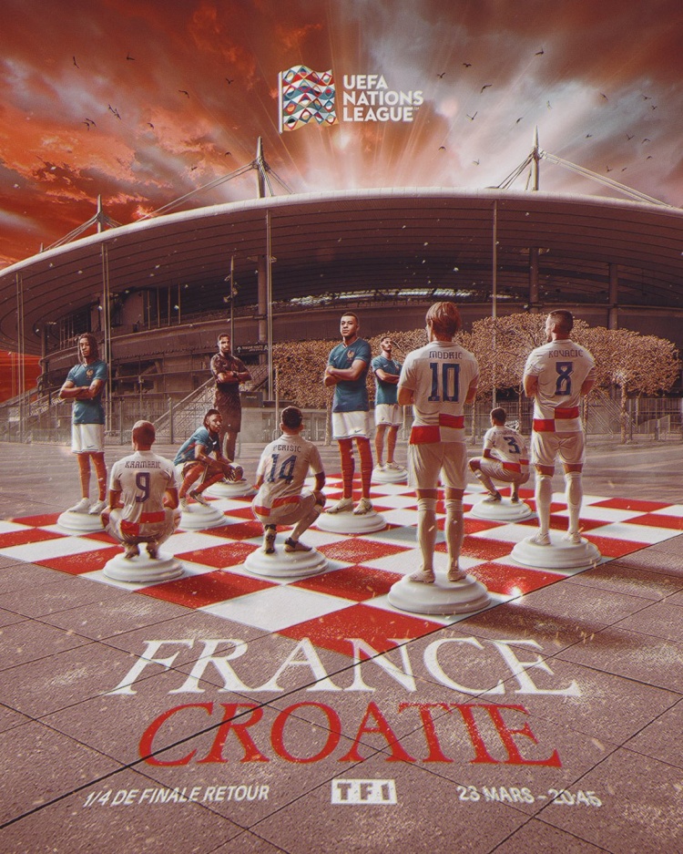 法國隊官方社媒發(fā)布了為次回合制作的海報,內容為兩隊球員在球場外的棋盤上對峙,姆巴佩、莫德里奇領銜出鏡。