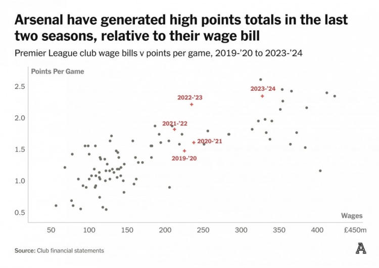 在過去兩個(gè)賽季中,阿爾特塔治下的阿森納開始不斷刷新自己賬單紀(jì)錄。2022/2023賽季,他們以英超第六高的人工成本,拿到了聯(lián)賽亞軍。上個(gè)賽季,他們則是以英超第五高的人工成本,再奪聯(lián)賽亞軍。