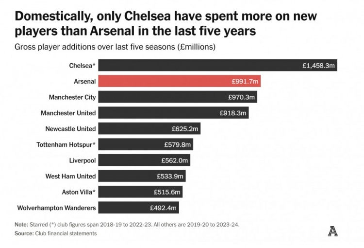 過去五年,只有切爾西在轉(zhuǎn)會(huì)市場上的投入超過阿森納