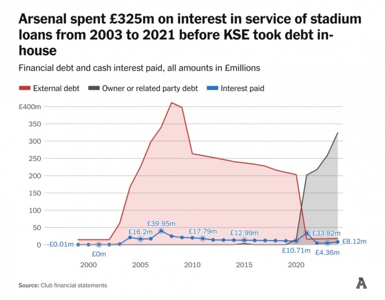 2003年到2021年,KSE內(nèi)部承擔(dān)債務(wù)之前,阿森納在球場貸款利息上花費(fèi)了3.25億英鎊