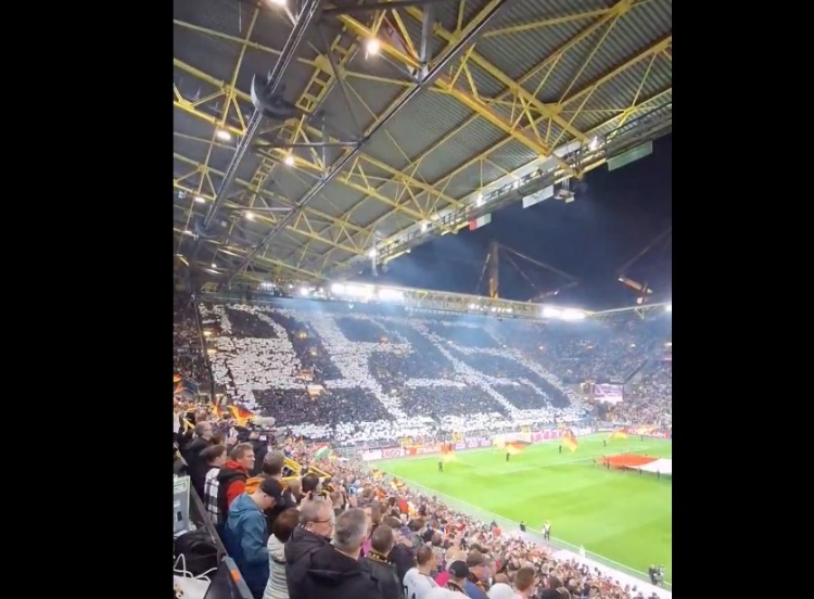 3月24日訊 德國在歐國聯(lián)八強(qiáng)戰(zhàn)次回合再戰(zhàn)意大利,賽前多特蒙德的主場球迷們打出了巨型TIFO致敬德國足協(xié)成立125周年。