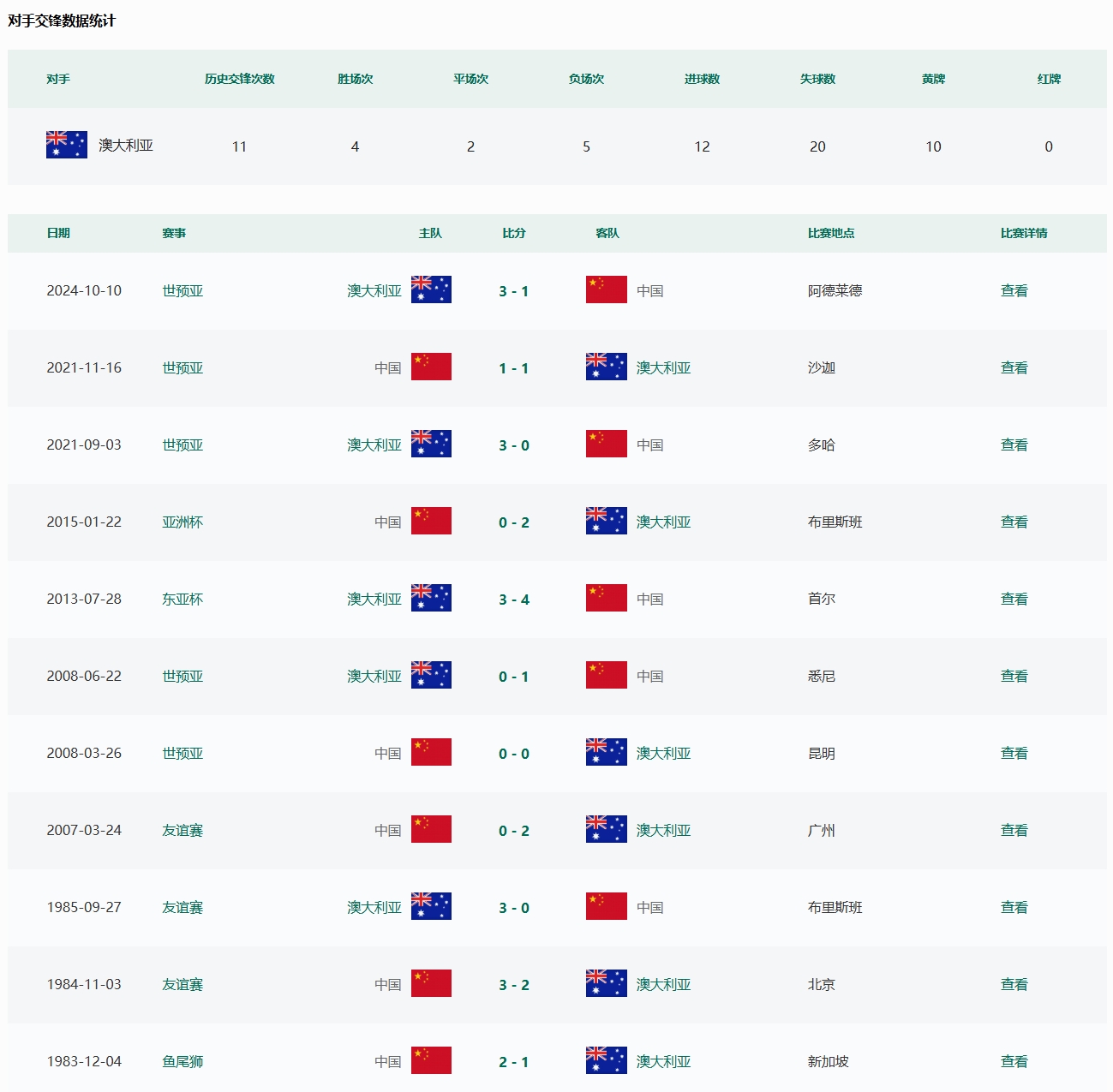 根據(jù)中國足協(xié)官網(wǎng)數(shù)據(jù)顯示,國足此前共11次交手澳大利亞,取得4勝2平5負(fù)的戰(zhàn)績。