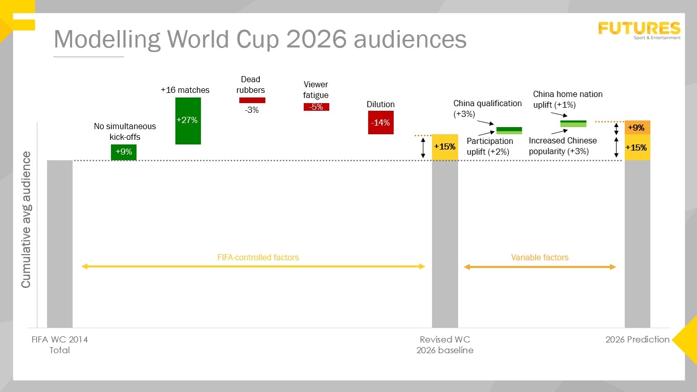我們對16支擴軍球隊進行了推測。主要受益者將是亞洲和非洲國家;這兩個大洲足聯(lián)在2026年可能各自擁有9支代表隊(相比2014年分別僅有4支和5支)。在此條件下參加世界杯賽事,預(yù)計可使相關(guān)市場的收視率提升約20%,其中可能包括一些未參加過2014年巴西世界杯的人口大國,如埃及(非洲足聯(lián))和土耳其(歐洲足聯(lián))。然而,迄今為止對全球收視率影響最大的變量將是中國是否晉級。中國晉級帶來的收視提升效應(yīng),將超過其余任何15支新晉球隊組合的總和。15支球隊的市場僅使我們預(yù)測的2026年總收視率增長2%,而單單中國晉級即可帶來額外3%的增長。