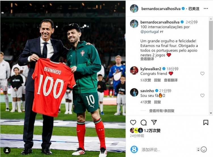此役是B席為葡萄牙隊(duì)出戰(zhàn)的第100場(chǎng)比賽,因此獲贈(zèng)紀(jì)念球衣。他在社交媒體上曬出照片,并寫(xiě)道:“為葡萄牙國(guó)家隊(duì)出戰(zhàn)100場(chǎng)比賽,我感到非常自豪和高興!我們進(jìn)入了四強(qiáng),感謝所有葡萄牙球迷在兩回合比賽中的支持。”