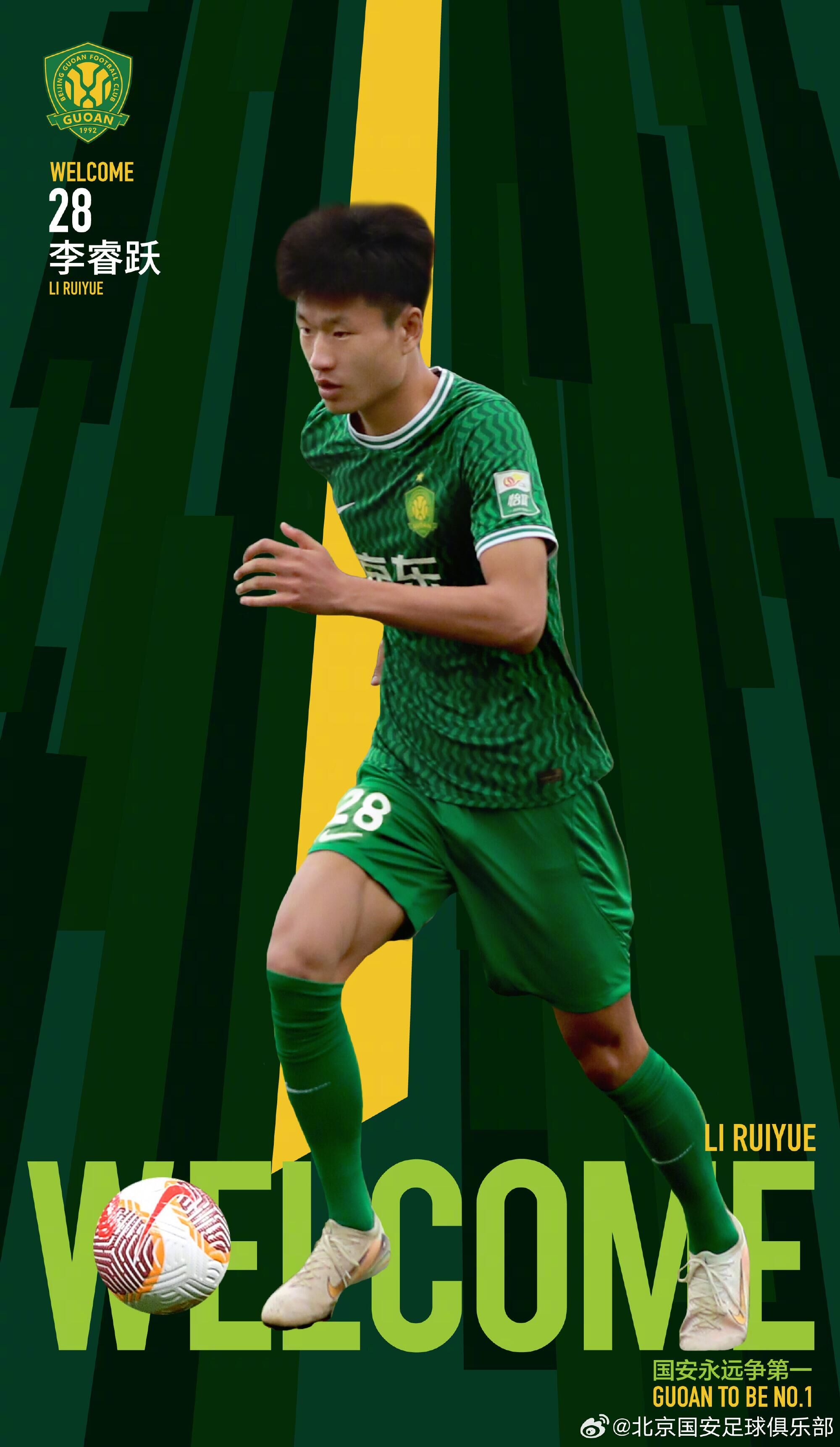 李睿躍正式加盟北京國安足球俱樂部,他將身披28號球衣,代表北京國安出戰(zhàn)本賽季中超聯(lián)賽、亞冠聯(lián)賽、足協(xié)杯等各項(xiàng)賽事。 李睿躍出生于2006年5月15日,身高192cm,體重79kg,司職中場。