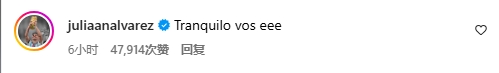 阿爾瓦雷斯也給德保羅評(píng)論道:“你冷靜點(diǎn)?!毙∥髅赡嵋渤霈F(xiàn)在評(píng)論區(qū),他寫道:“哎喲,不愧是帥哥啊,媽呀呀呀????????”
