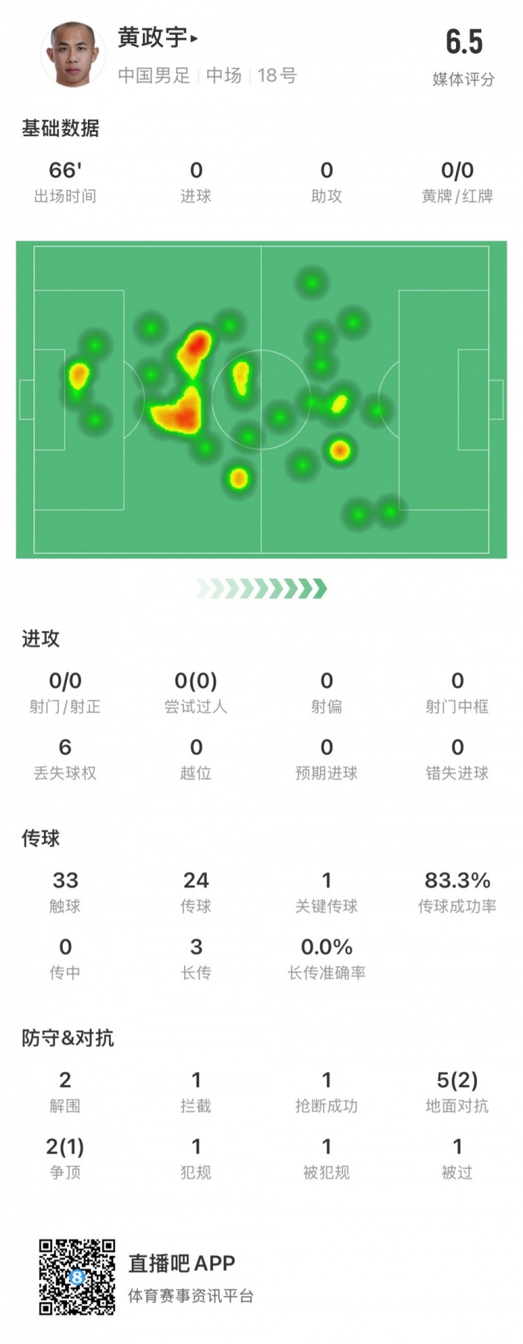 黃政宇數(shù)據(jù):出場(chǎng)66分鐘,地面對(duì)抗5次成功2次,關(guān)鍵傳球1次