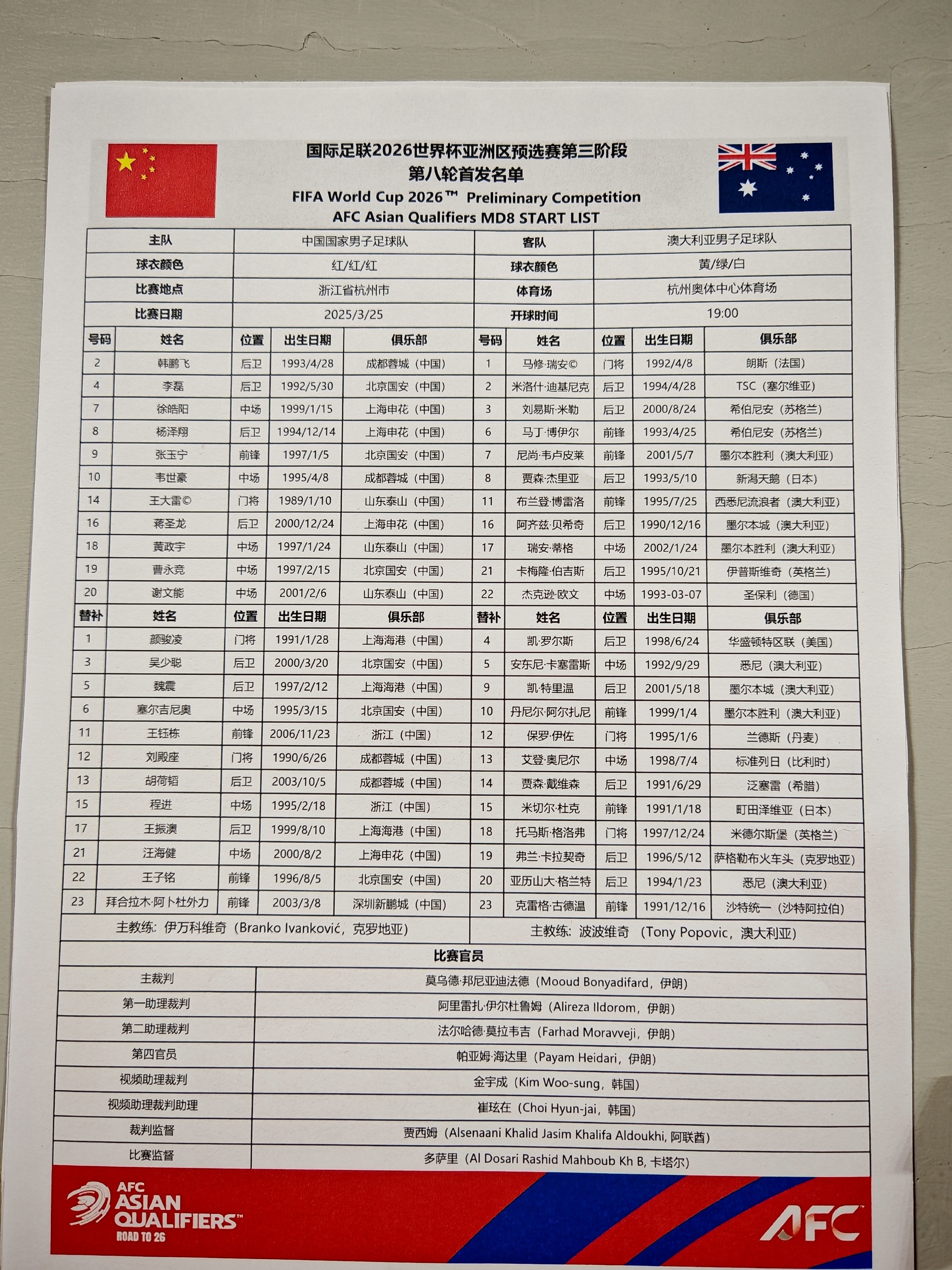 - 少見!中澳之戰(zhàn)首發(fā)名單為全中文版彩色