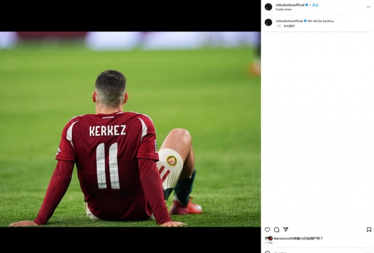匈牙利本次國際比賽日兩戰(zhàn)皆墨,兩回合1-6輸給了土耳其,科爾克茲曬出自己的照片,并寫道:“我們會(huì)回來的!”