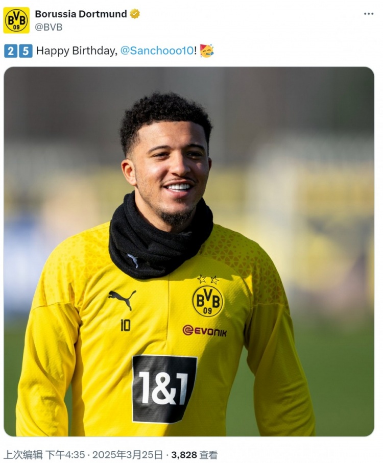 多特官方社媒曬出桑喬效力球隊(duì)時(shí)期的照片,并配文:“祝你25歲生日快樂,桑喬!”