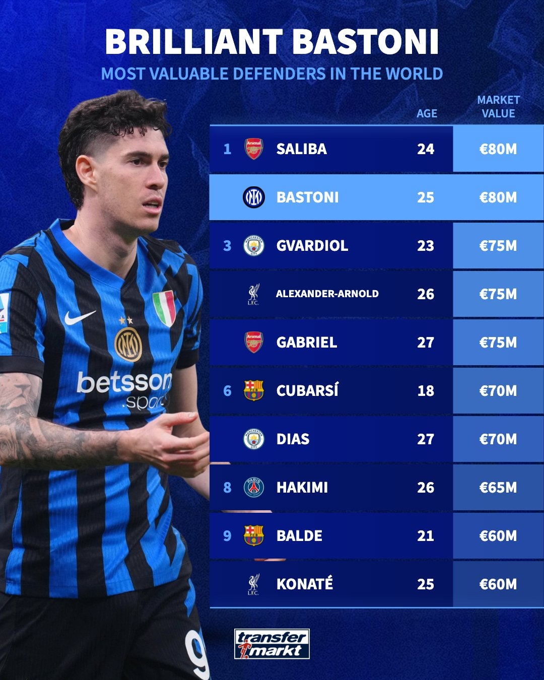 德轉(zhuǎn)最新后衛(wèi)身價top10:巴斯托尼8000萬歐,與薩利巴并列第1