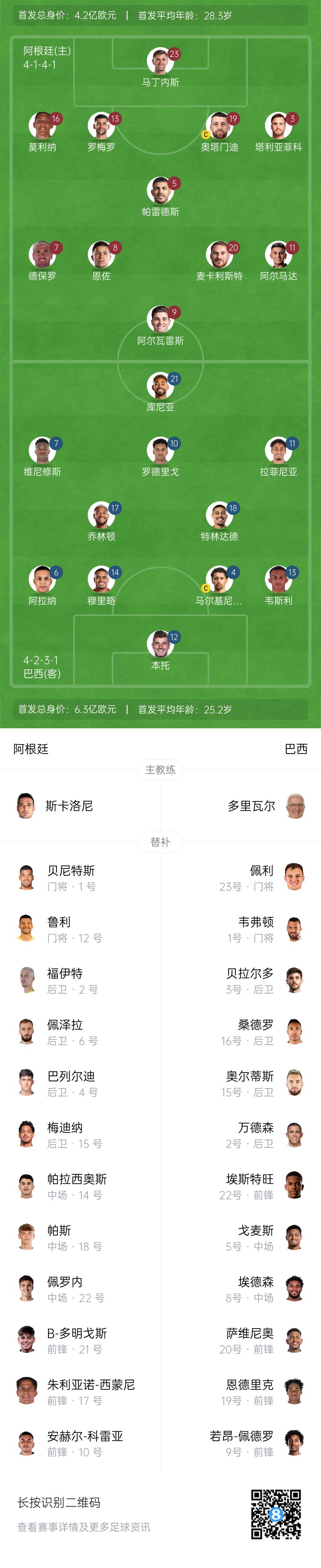 阿根廷首發(fā):23-馬丁內(nèi)斯、16-莫利納、13-羅梅羅、19-奧塔門(mén)迪、3-塔利亞菲科、7-德保羅、5-帕雷德斯、20-麥卡利斯特、8-恩佐、11-阿爾馬達(dá)、9-阿爾瓦雷斯