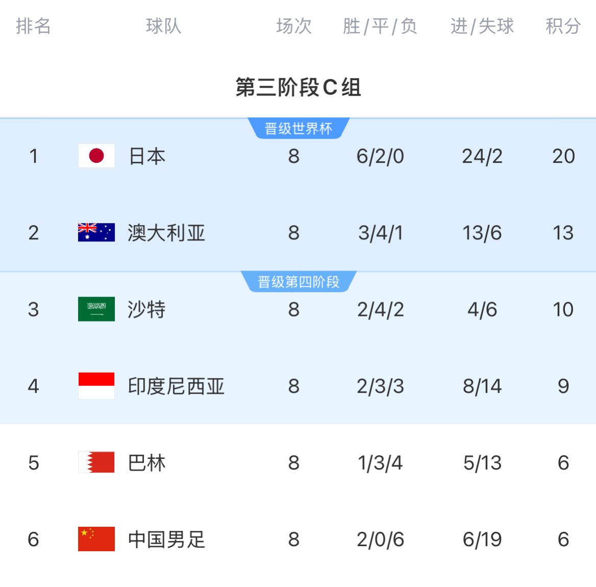 目前C組積分榜中,日本隊積20分提前晉級,澳大利亞隊積13分位列第二,沙特阿拉伯隊積10分排名第三,印度尼西亞隊積9分排名第四,巴林隊和中國隊積6分小組墊底。根據(jù)世預賽規(guī)則,18強賽小組前兩名直通美加墨世界杯,第三名和第四名將參加下一階段附加賽。中國隊已無緣直通名額,只能競爭小組前四,爭取進入附加賽。