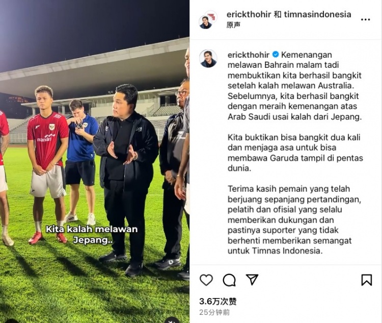 托希爾為這條Vlog配文寫道:“昨晚與巴林隊的勝利,顯示我們已經(jīng)從慘敗澳大利亞的比賽中振作起來,而此前我們也在客場慘敗日本隊后,主場擊敗沙特重新振作。我們證明了自己兩度跌倒,兩度爬起,希望我們能繼續(xù)努力,讓印尼足球在世界舞臺上展現(xiàn)自己?!?/p>