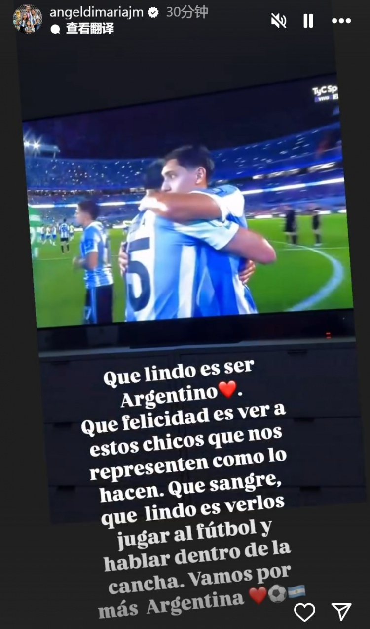 迪馬利亞曬出自己在家中觀賽的照片,并寫道:“作為阿根廷人是多么美好啊????吹竭@些孩子們用他們的方式代表這支球隊出戰(zhàn),我們感到非常高興。多么熱血,看到他們在場上踢球、聊天是多么美好。讓我們更加努力吧,阿根廷??!”