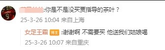 有網(wǎng)友在評(píng)論里留言提問“你是不是沒買賈指導(dǎo)的茶葉?”對(duì)此王霜回復(fù)寫道:“謝謝啊,不需要買,他送我們姑娘喝?!?/p>