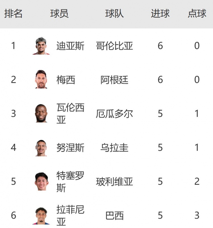 南美區(qū)世預(yù)賽射手榜:迪亞斯6球平梅西并列榜首,努涅斯&拉菲5球